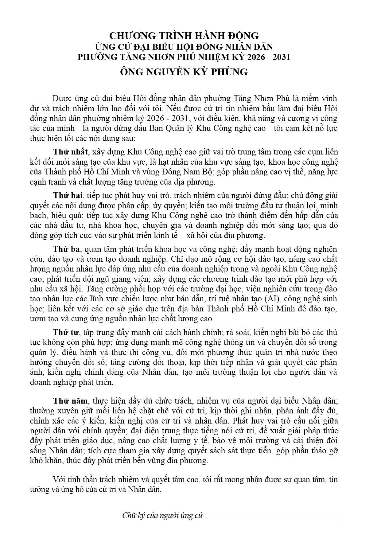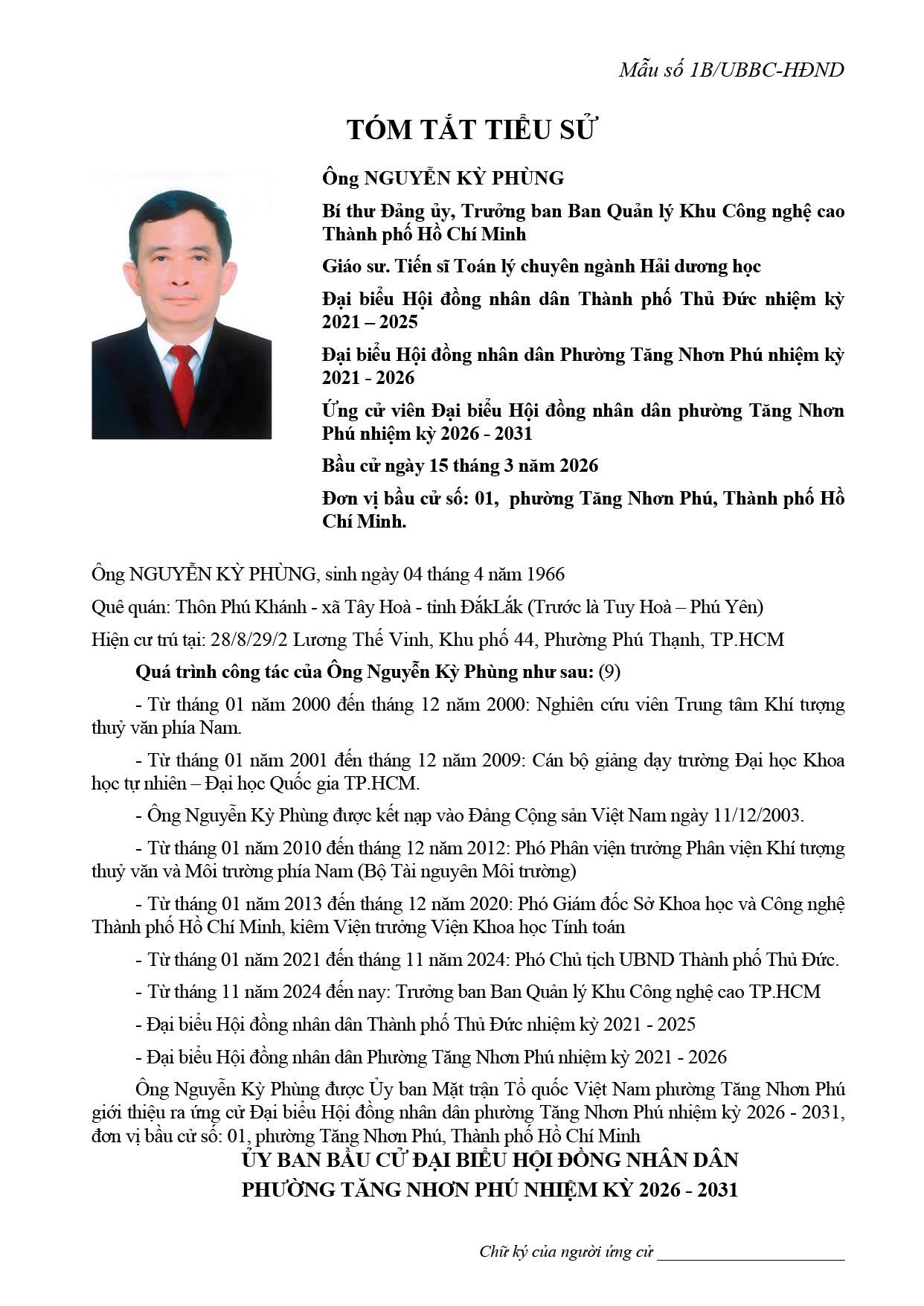 Trân trọng thông tin về tiểu sử tóm tắt và chương trình hành đồng của Đồng chí Nguyễn Kỳ Phùng – Bí thư Đảng ủy, Trưởng ban Ban Quản lý Khu Công nghệ cao Thành phố Hồ Chí Minh ứng cử Đại biểu Hội đồng nhân dân phường Tăng Nhơn Phú, nhiệm kỳ 2026 – 2031.